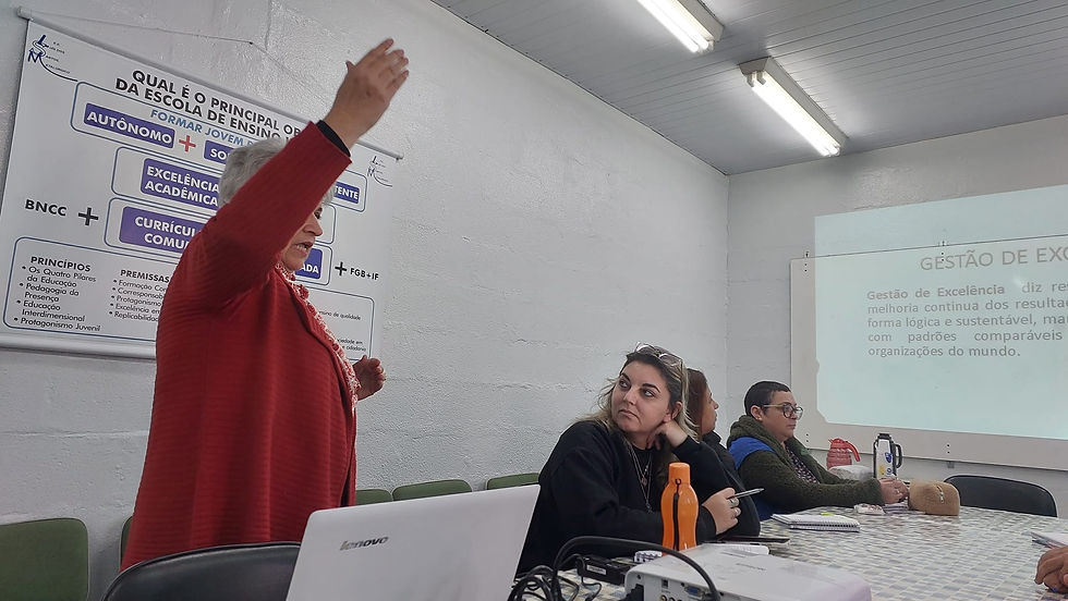 O encontro abordou a gestão escolar a partir da perspectiva de resultados organizacionais, destacando a importância da revisão de procedimentos, da organização das estruturas internas e do alinhamento das ações pedagógicas e administrativas. Foram discutidos aspectos como eficiência no gerenciamento das atividades escolares, sustentabilidade das decisões e responsabilidade coletiva na condução dos processos.